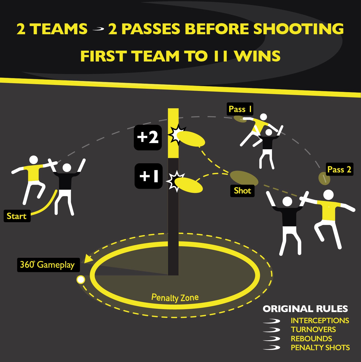 Disc It is the world's first team disc game to combine fast-paced action with strategic gameplay. Two teams compete to hit a color-coded pole with a flying disc to score points, all while navigating penalty zones and engaging in interceptions, rebounds, and turnovers. The gameplay is a continuous flow of offense and defense, offering a thrilling challenge for beginners and seasoned athletes alike.